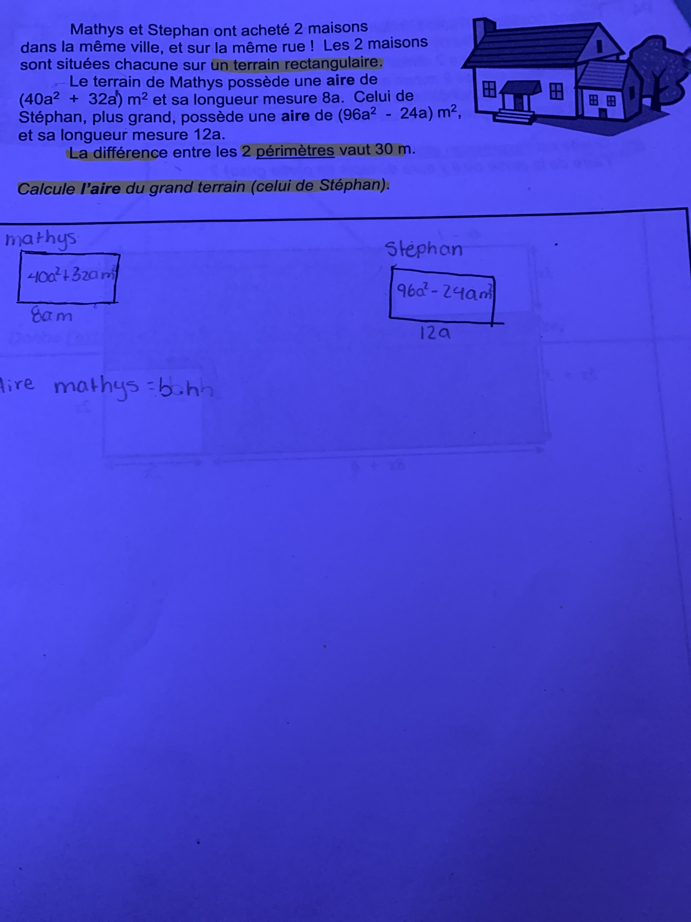 2) pour chaque maison, calcule la largeur en faisant: Aire divisée par Longueur (tu obtiens une équation du premier degré).