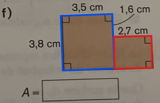 Pour le numéro f), c'est la même chose, tu dois décomposer la figure en deux. Tu peux la décomposer comme ceci :