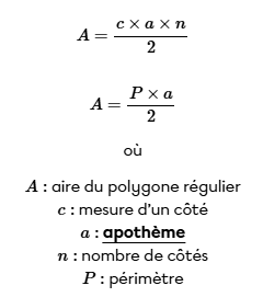 Pour le pentagone, tu dois utiliser cette formule pour trouver son aire :