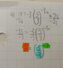Pour le numéro a), le 5 est la puissance que tu dois transformer en argument, le -3x est l'exposant à transformer en logarithme, et le 5/3 est la base.