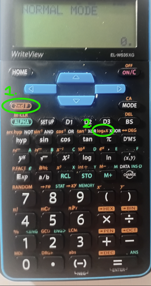 Pour calculer un logarithme avec une base différente de 10 sur ta calculatrice, tu dois d'abord cliquer sur le bouton orange "2ndF" (ce bouton te permettra d'accéder aux options en orange), puis sur le bouton π (pour accéder à \(log_{a}X\), qui est en orange plus haut). Tu pourras alors écrire \(log_{12}36\).