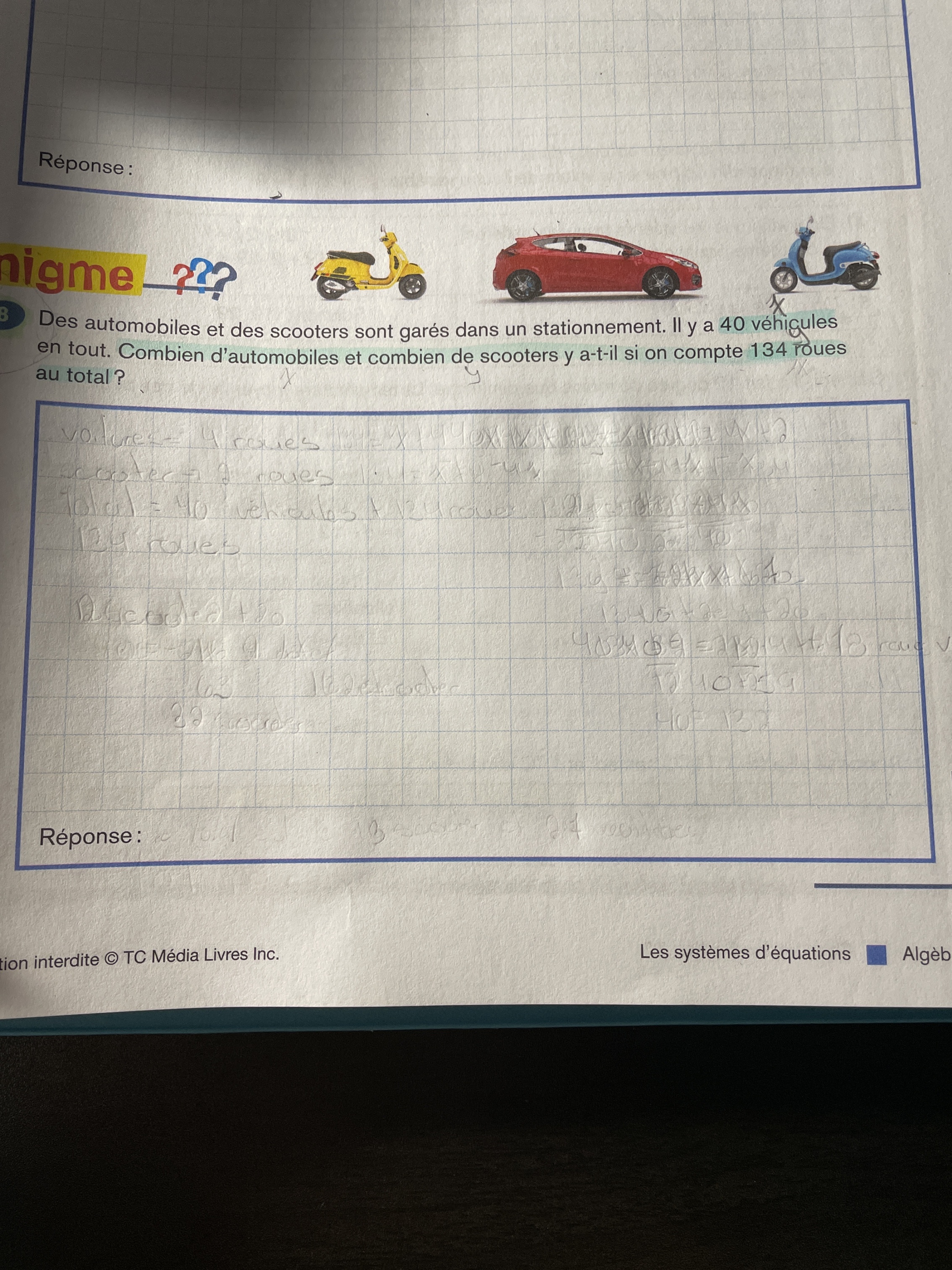 Ainsi, quelle serait l'équation s'il y a x autos, y scooters et 134 roues en tout?