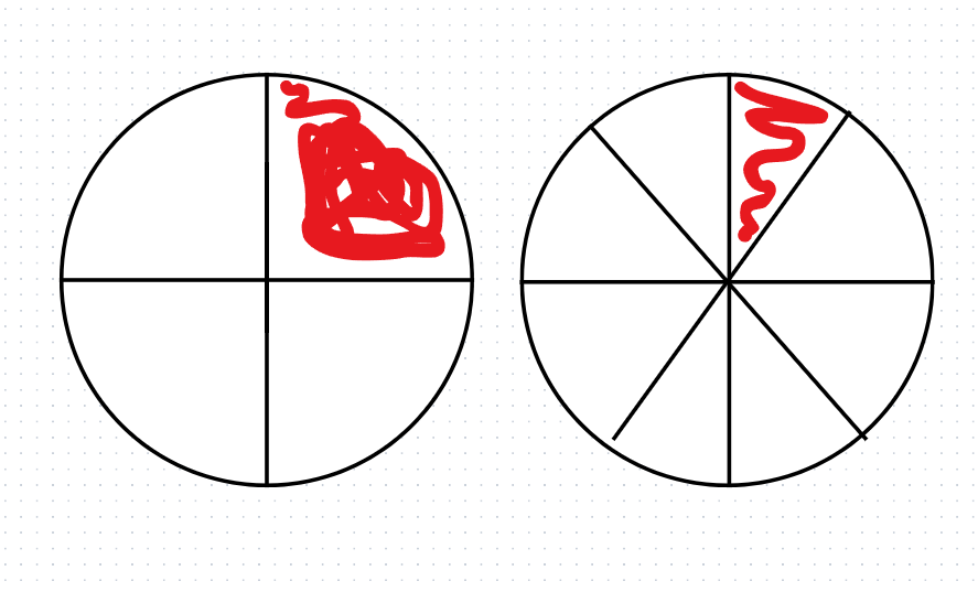 Par exemple, si on coupe la pizza en 8 pointes, alors :