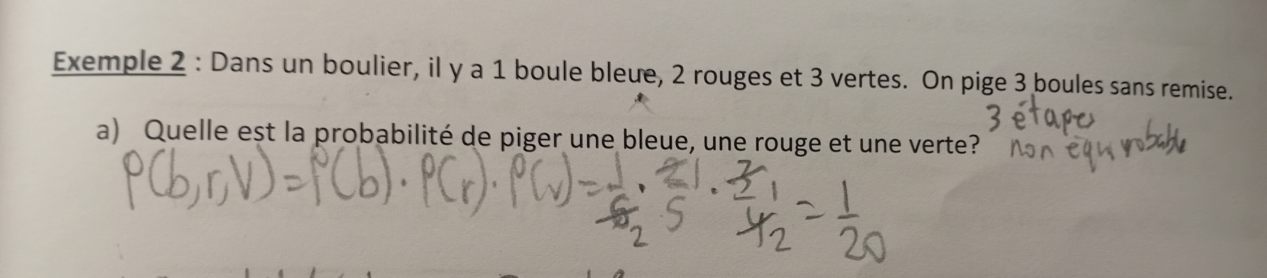 Pour le numéro 2, je ne pense pas que l'ordre soit nécessaire, puisque ce n'est pas mentionné dans l'énoncé, on demande simplement la probabilité d'avoir une bleue, une rouge et une verte, sans préciser que le tirage doit se faire dans cet ordre-là exactement. La réponse ne serait alors pas 1/20. Cela dit, tu peux vérifier avec ton professeure pour ça, peut-être qu'elle a ajouté une précision en classe par rapport à l'énoncé.