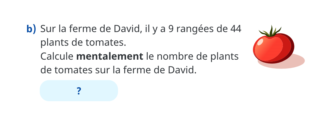 Tu dois trouver et effectuer l'opération qui permet d'obtenir le nombre de plants de tomates totales s'il y a 9 rangées de 44 plants chaque. Une fois que tu trouves l'opération, tu dois essayer de l'effectuer mentalement, sans papier.