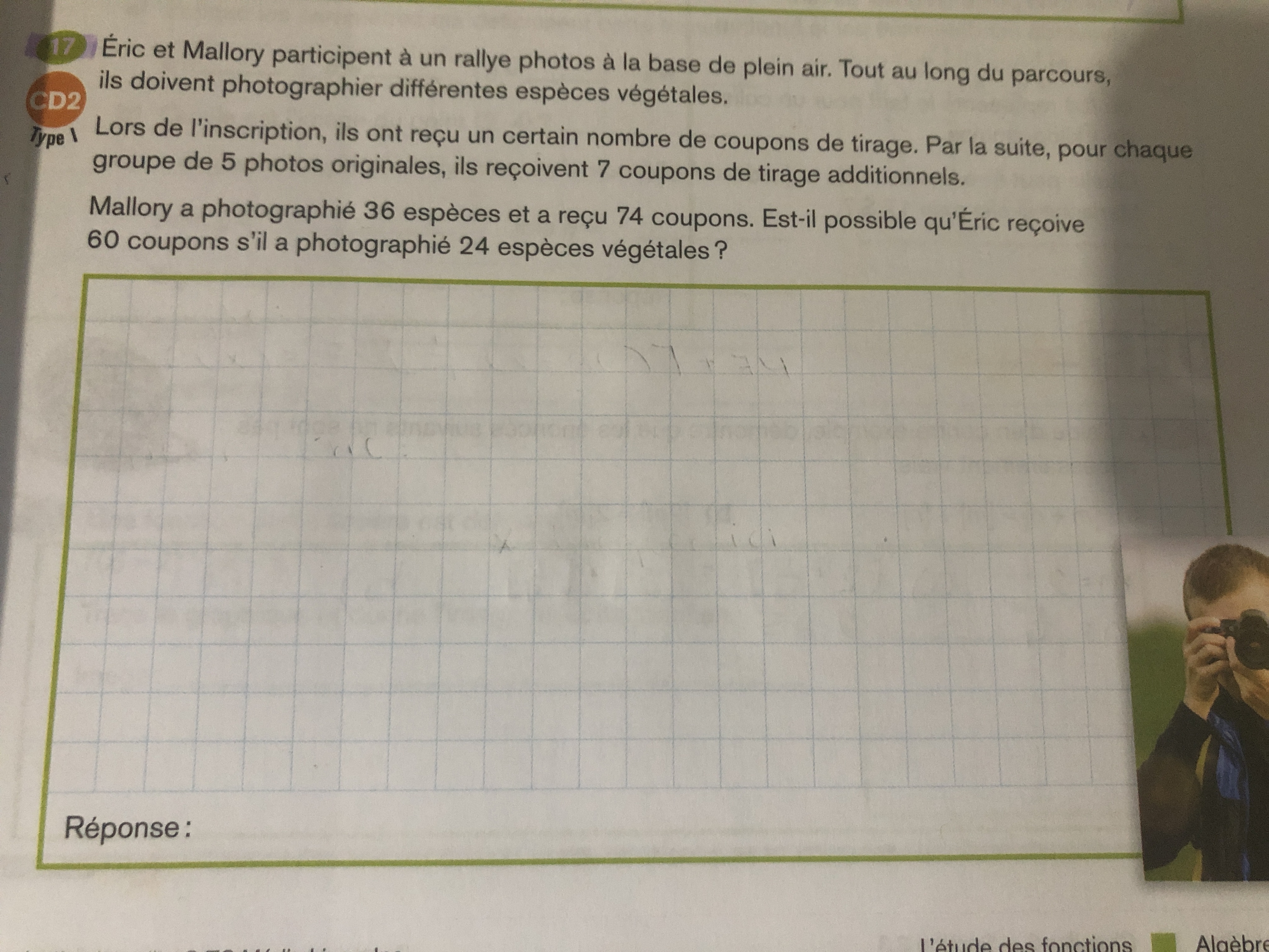 Tu dois trouver la règle du nombre de coupons en fonction du nombre de photos: \(f(x) = a[b(x-h)]+k\).