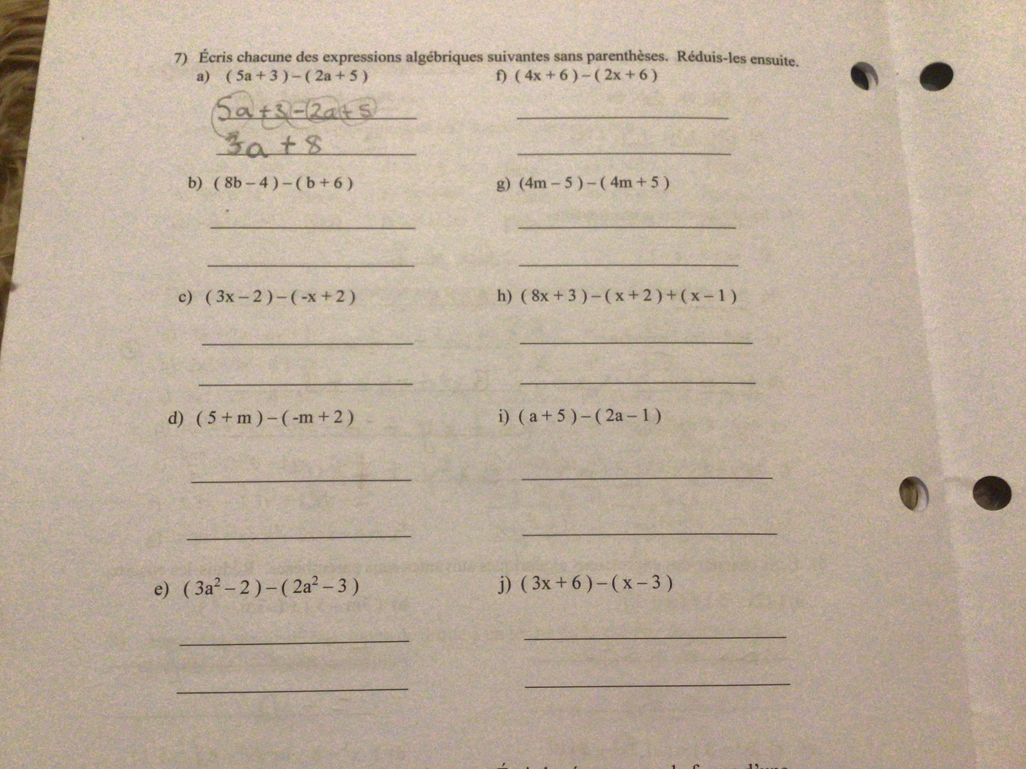 Ainsi, pour le 7a), tu as obtenu la bonne réponse. Il faut donc résoudre ce qui est dans chaque parenthèse puis ensuite mettre ensemble le tout. Dans ce cas-ci, il n'y avait rien à résoudre dans les parenthèses