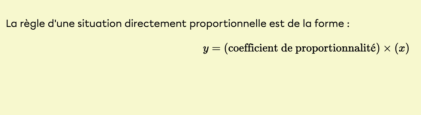 Afin de trouver le coefficient de proportionnalité, c’est-à-dire le nombre par lequel il faut multiplier les valeurs de la première variable pour obtenir les valeurs associées de la deuxième variable dans la situation directement proportionnelle, nous devons utiliser la règle suivante :