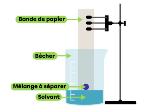 Le processus est assez simple, on prend une bande de papier et à la base, on ajouter le mélange que l'on veut séparer. Ensuite, on place la base de la feuille dans un bécher d'eau ou d'alcool, sans tremper le mélange dans le solvant. Voici à quoi ressemble le montage: