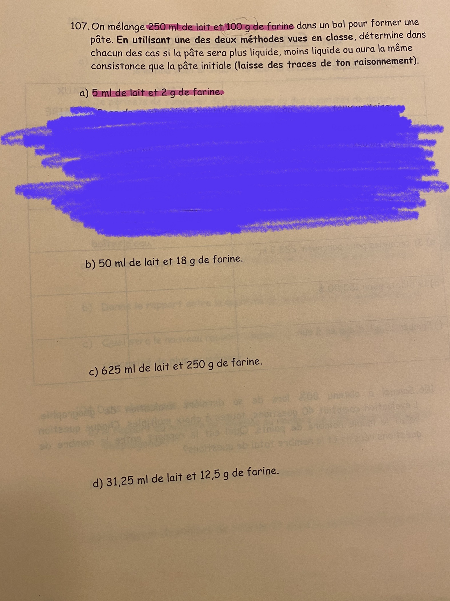 Dans ce problème, on souhaite comparer le rapport 250 mL de lait pour 100 g de farine aux différents rapports des questions a, b, c et d.