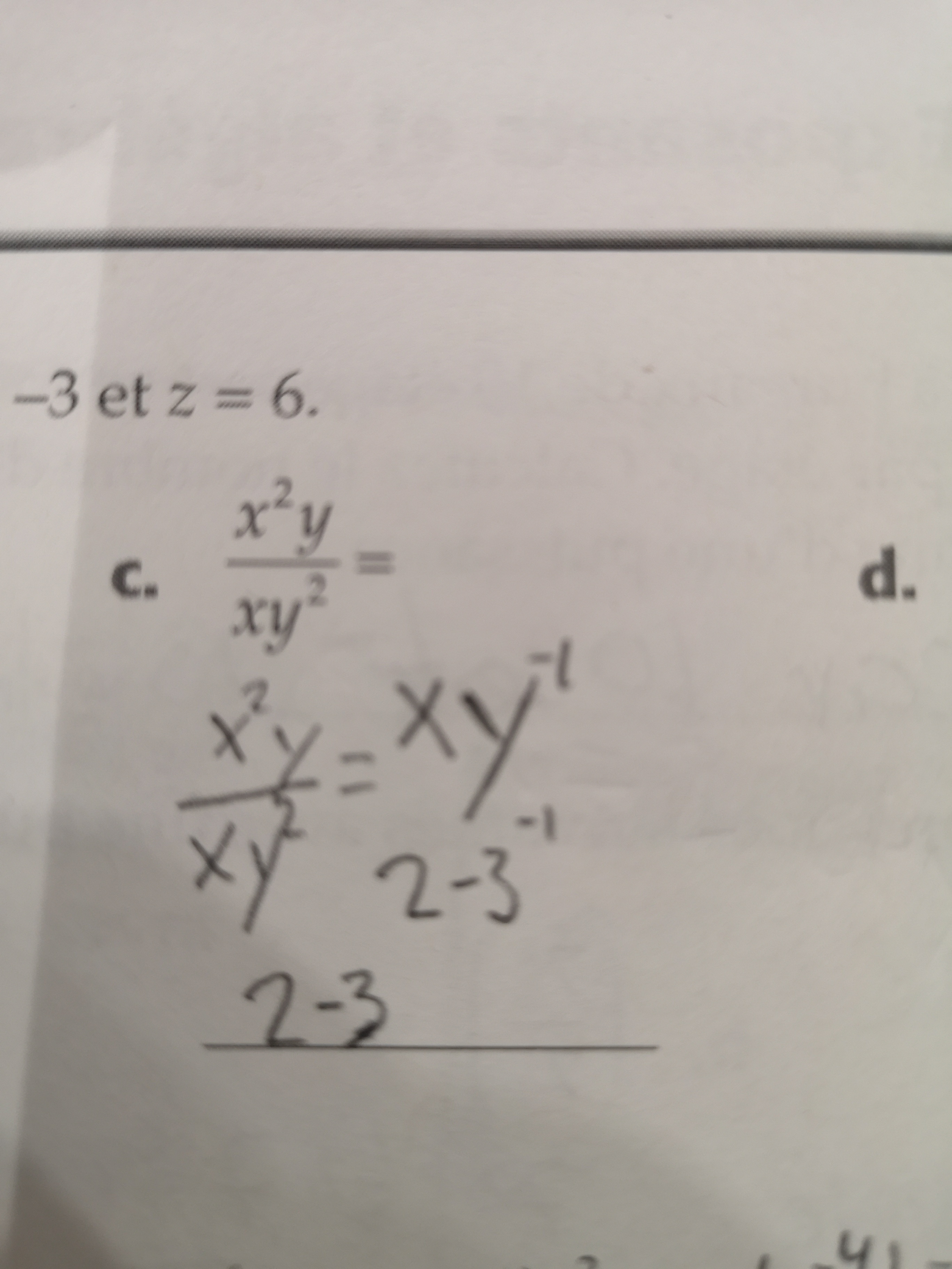 Pour revenir à ce que tu as écrit, il aurait fallu entourer le -3 de parenthèse, puisque c'est -3 qui est affecté de l'exposant -1, et -3 n'est pas soustrait de 2, il est multiplié! Il fallait donc écrire :