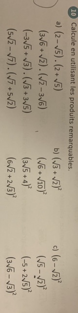 Bonsoir,je ne comprend pas cet exercice,pourriez vous m’aider en mathématiques sur les racines carrés avec les produits remarquables? Je ne comprend vraiment pas