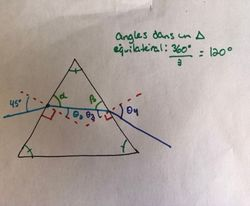 Je ne comprends pas trop comment le réaliser. Je sais que selon la loi Snell Descartes, nous avons n1=1, angle d'incidence=45, n2=1,5 et angle de réfraction=?. Je suis capable de trouver la mesure de l'angle de réfraction et après, je ne sais plus quoi faire. Quelles propriétés du triangle équilatéral je dois me fier?