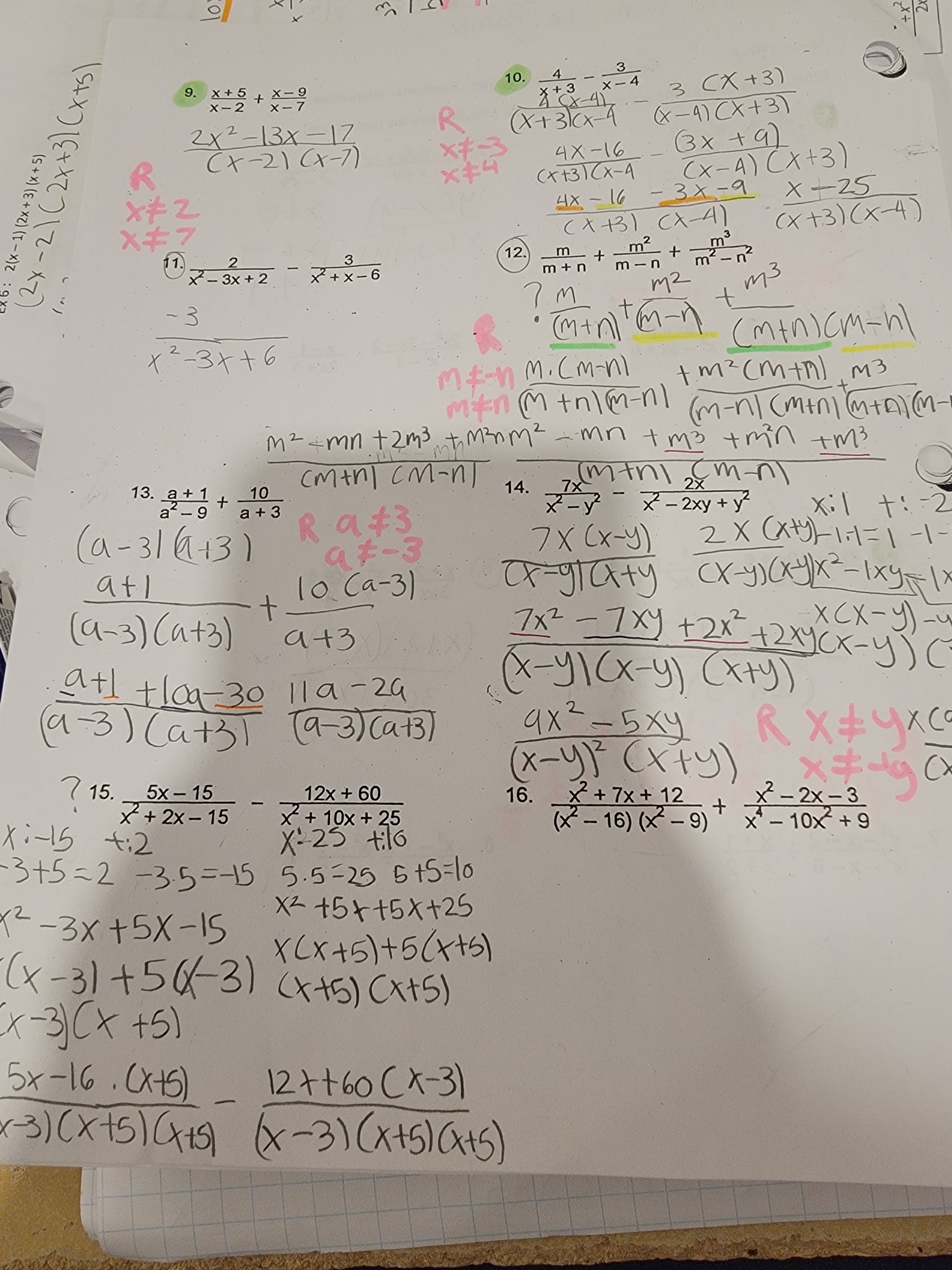Il faudra factoriser. Quand cela vient à factoriser le trinome sous forme de ax² + bx + c, il faudra décomposer le terme bx, comme tu as fait pour le numéro 15 et que tu devras faire au numérateur et dénominateur pour le numéro 16. Après avoir fait ceci, tu constateras souvent que des paranthèses s'élimineront: celles qui se trouvent au numérateur et dénominateur. Par la suite, c'est simple, il faut mettre les fractions sur le meme dénominateur et poursuivre avec les opérations. Sache que pour factoriser un binome sous forme ax² + c, c'est comme si le bx s'élimine du aux signes opposés des termes. Par exemple pour x²-16, les termes seront (x-4)(x+4). Mais, la factorisation peut etre accomplie en faisant la racine carrée du c s'il s'agit d'une addition, comme par exemple, pour x²+16, c'est (x+4)² = 16.