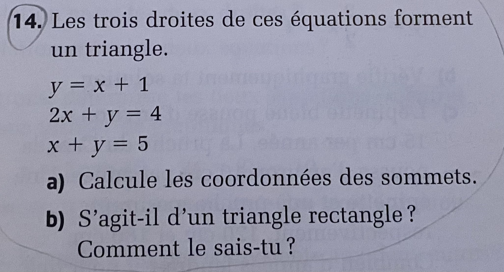 Pour la question 14 a), on sait que les trois droites forment un triangle, c'est-à-dire que chacune de ces droites croisent les deux autres droites pour former un sommet du triangle. Ainsi, pour trouver le sommet des triangles, il faut trouver les points d'intersection des droites. Tu dois trouver le points d'intersection de la 1e droite et de la 2e droite, de la 1e et de la 3e, et de la 2e et de la 3e. Pour trouver un point d'intersection de deux droites, plusieurs méthodes peuvent être employé. En utilisant la méthode de comparaison, puisqu'on sait que le x et le y cherchés sont les mêmes pour les deux fonctions, on va poser y = y, remplacer y par la règle de la fonction, puis isoler x (ou L'inverse, poser x = x, puis isoler y). Voici un exemple :