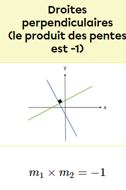 Pour le b), on sait que dans un triangle rectangle, il y a un angle droit, et donc 2 de ses côtés sont perpendiculaires. Ainsi, pour déterminer s'il s'agit d'un triangle rectangle, il faut trouver si deux de ces droites sont perpendiculaires entre-elles. Deux droites sont perpendiculaires lorsque le produit de leur pente donne -1