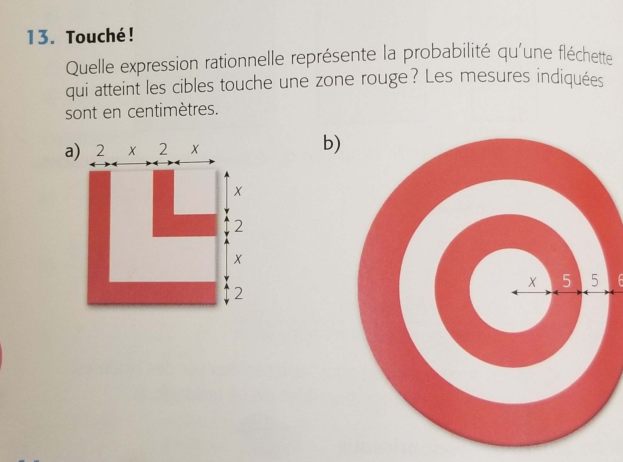 Donc, dans ce cas, la probabilité de toucher la zone rouge est égale à l'aire totale de la zone rouge sur l'aire totale de la forme (blanc et rouge), ce qui te donnera une expression rationnelle sous forme de fraction qu'il te faudra simplifier. Je te propose donc d'essayer de trouver l'expression qui correspond à l'aire totale de la zone rouge, puis celle qui correspond à la zone complète (blanche et rouge). Si tu n'y arrives pas, je te laisse ma démarche ci-dessous:)