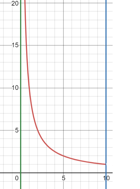 Cependant, puisque le domaine de la fonction est défini comme étant ]0,10], il y aura un minimum, soit le point dont x = 10. Il n'y aura pas de maximum, puisque l'asymptote de la fonction est sur x = 0.