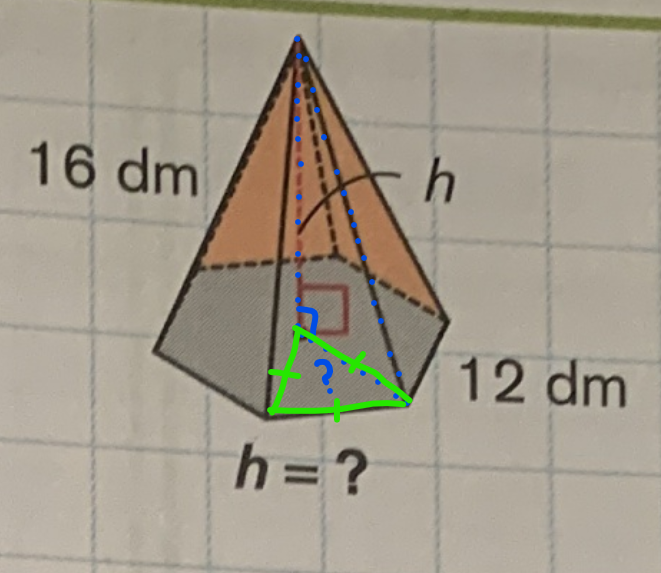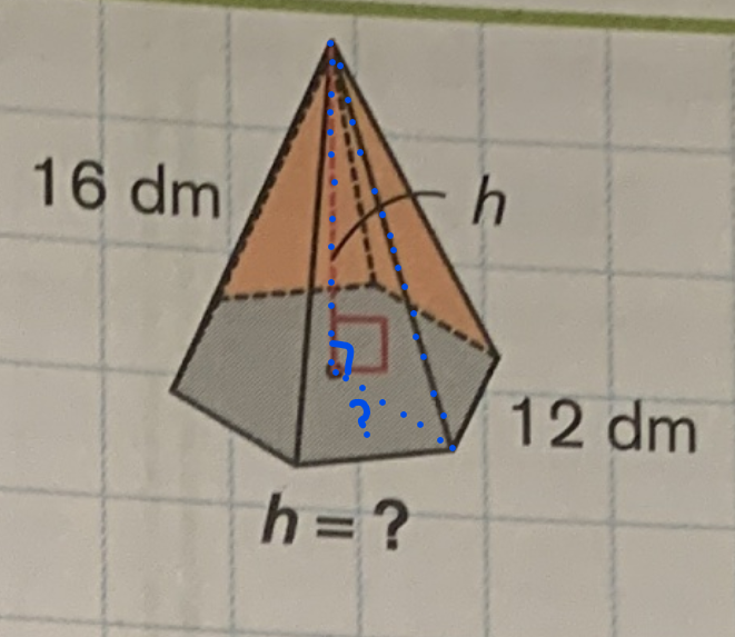On cherche la mesure de la cathète h, en connaissant la mesure de l'hypoténuse, soit 16 dm, mais en ne connaissant pas encore la mesure de l'autre cathète. Il faut donc d'abord trouver la mesure de cette cathète manquante. Puisqu'un hexagone est formé de 6 triangles équilatéraux, la mesure de la cathète est donc égale à la mesure du côté du pentagone, soit de 12 dm.
