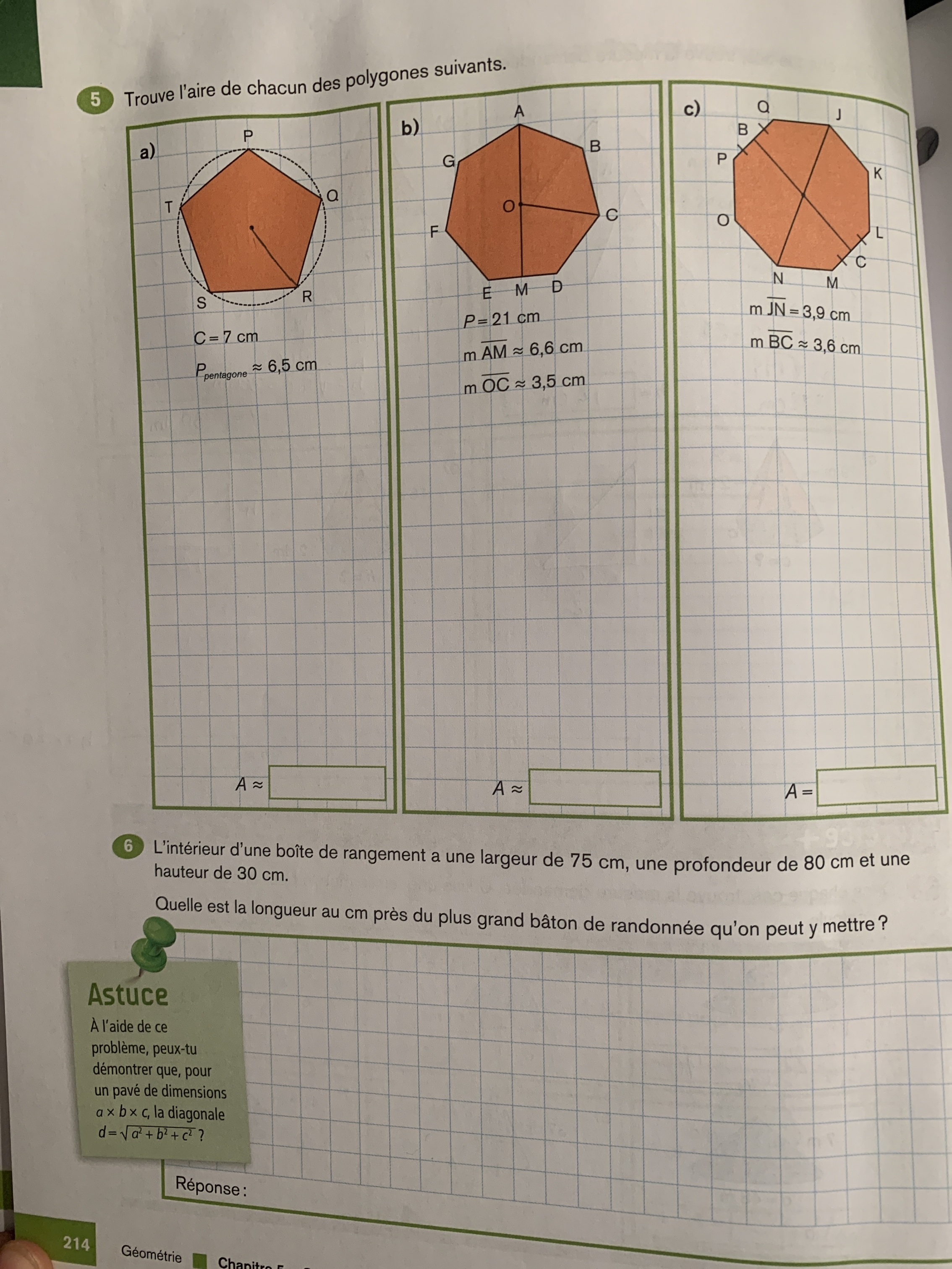 Pour le numéro a), tu connais la mesure du périmètre, et il te manquerait celle de l'apothème. Pour déterminer celle-ci, tu pourrais tracer le triangle rectangle suivant :