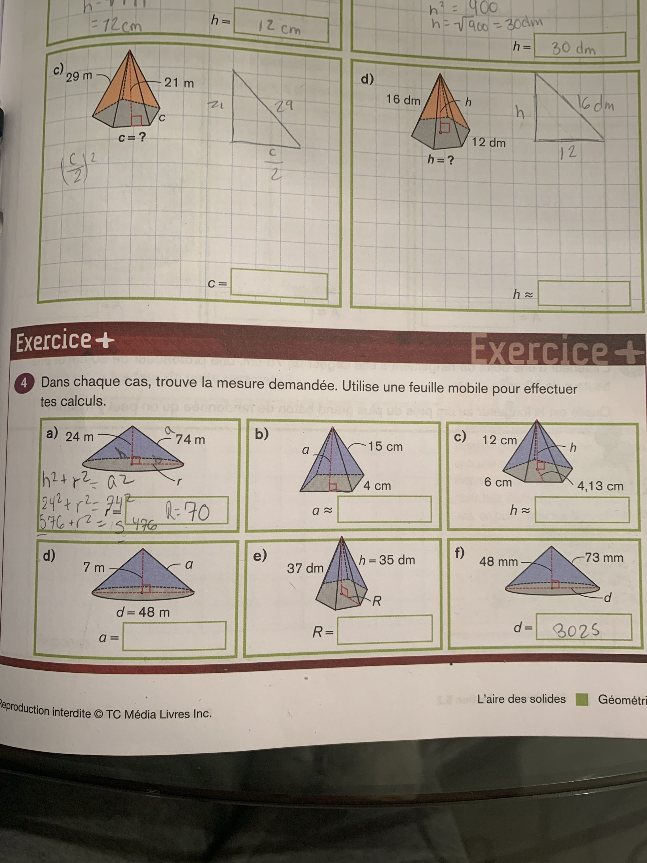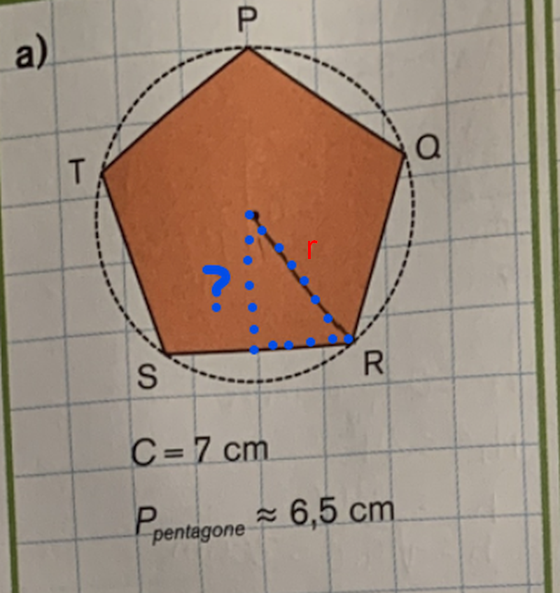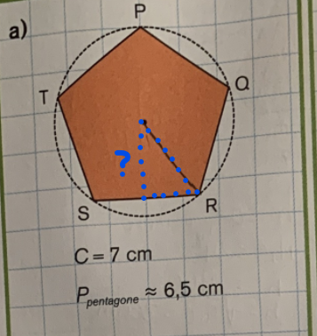 Pour compléter la réponse du no 5 a), l'hypoténuse du triangle bleu est le rayon r du cercle qu'on peut calculer à partir de la circonférence C=7 cm.