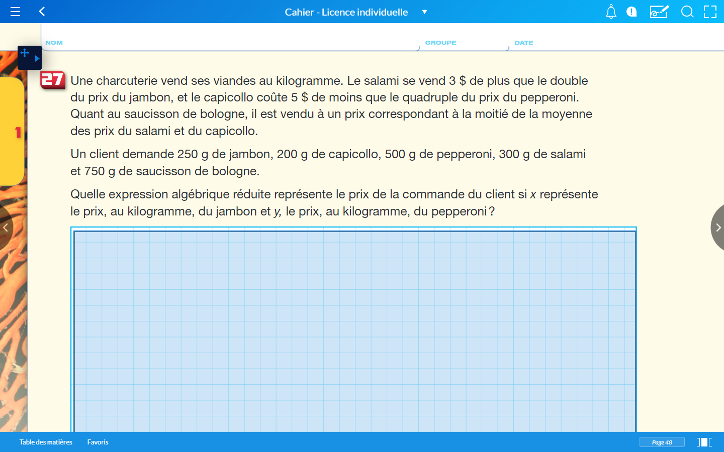 Je vais t'aider pour le premier et te laisser compléter le reste. Le salami se vend 3$ de plus que le double du prix du jambon. Tu dois traduire cela en langage mathématique. Donc , le prix du jambon est de x, et le salami est 3$ de plus que le double. Donc on double le prix du jambon (2x) puis on rajoute 3$. Nous avons alors