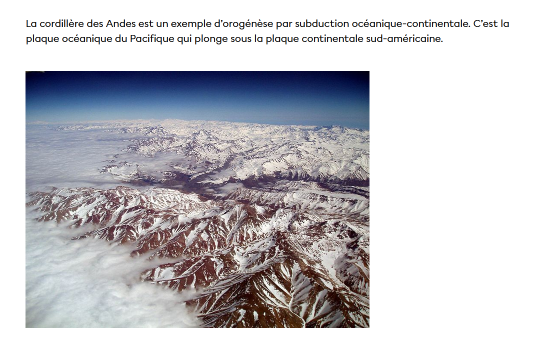 Exemple la cordillière des Andes est le résultat du soulèvement et du plissement de la croûte terrestre tout le long du contact (zone de subduction) de la plaque du Pacifique Sud et la plaque du continent Sud-américain.