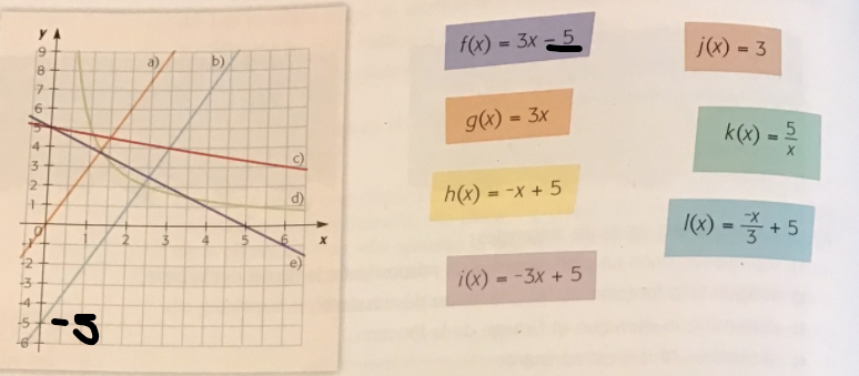 Pour identifier rapidement les fonctions linéaires, tu peux identifier les ordonnées à l'origine de chaque fonction, puis associer l'ordonnée trouvée à la valeur de b dans la règle. Par exemple, en identifiant l'ordonnée à l'origine de la fonction b), j'ai pu déterminer qu'il s'agissait de la règle en mauve, puisque le b de cette règle est -5.