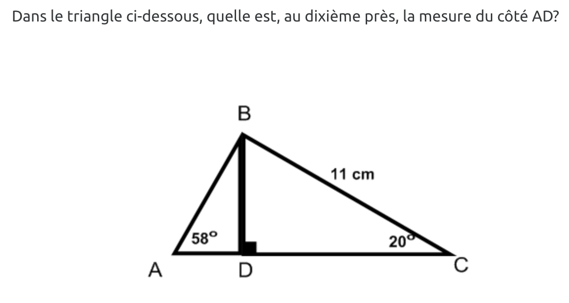 On a un angle de 58° et 20°. Si on fait leur somme, on aura 78°. Encore une fois, la somme des angles d'un triangle=180°. 180°-78°=102°. La hauteur de ce triangle est une médiane, alors on peut diviser par 2 le 102° pour avoir l'angle manquant pour le triangle ABD. 102/2= 51.