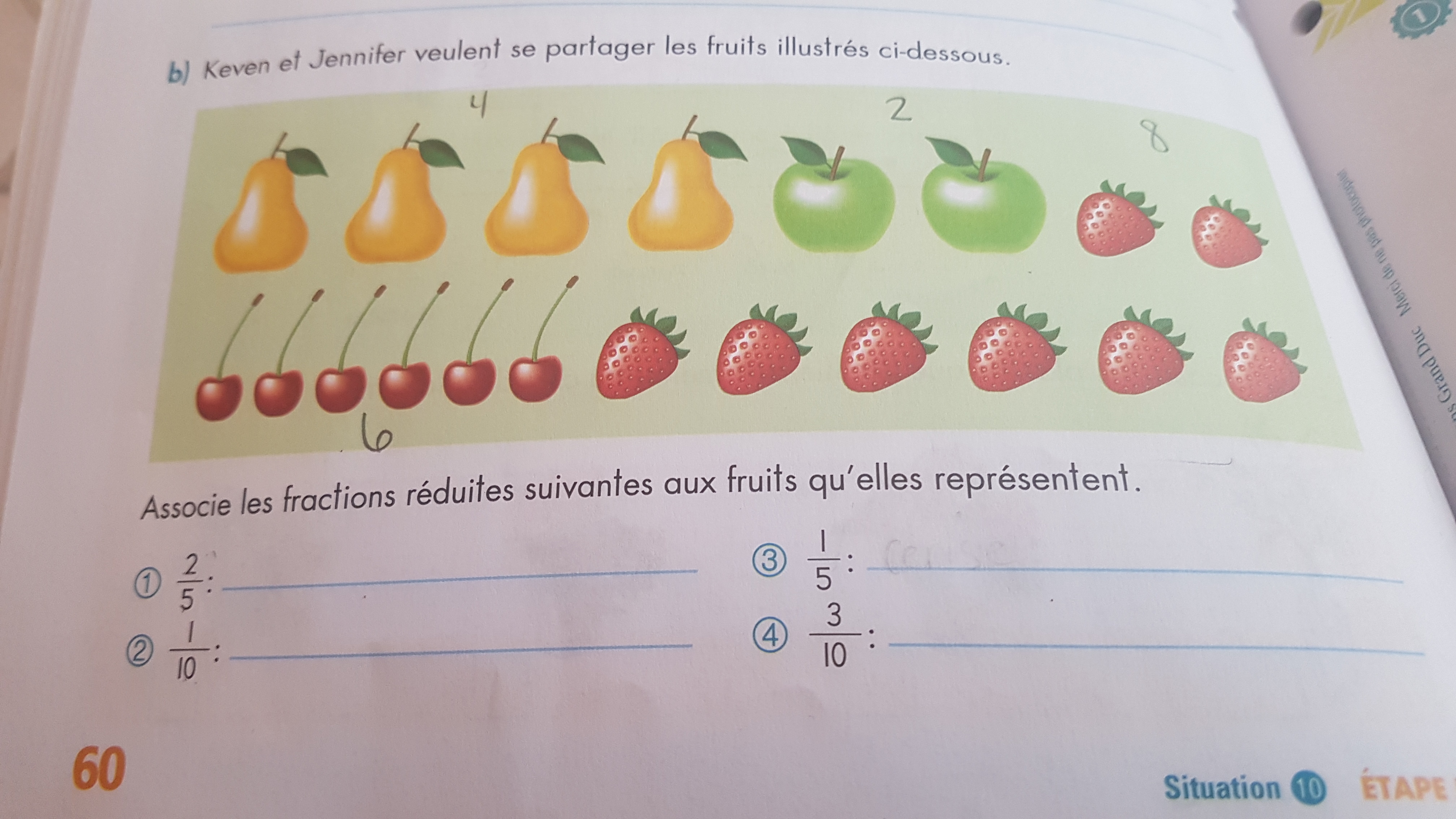 C'est donc la fraise qui représente le 2/5 du tout. 2/5 est donc simplement la fraction réduite de 8/20.