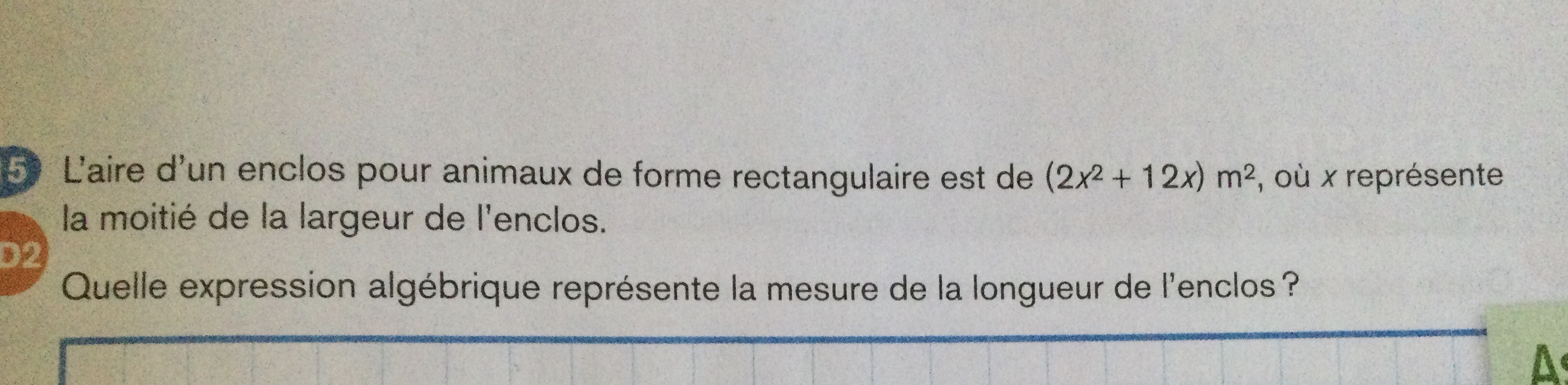 Il ne reste plus qu'à isoler la variable longueur dans l'équation ci-dessus pour trouver l'expression algébrique correspondante à la longueur de l'enclos.