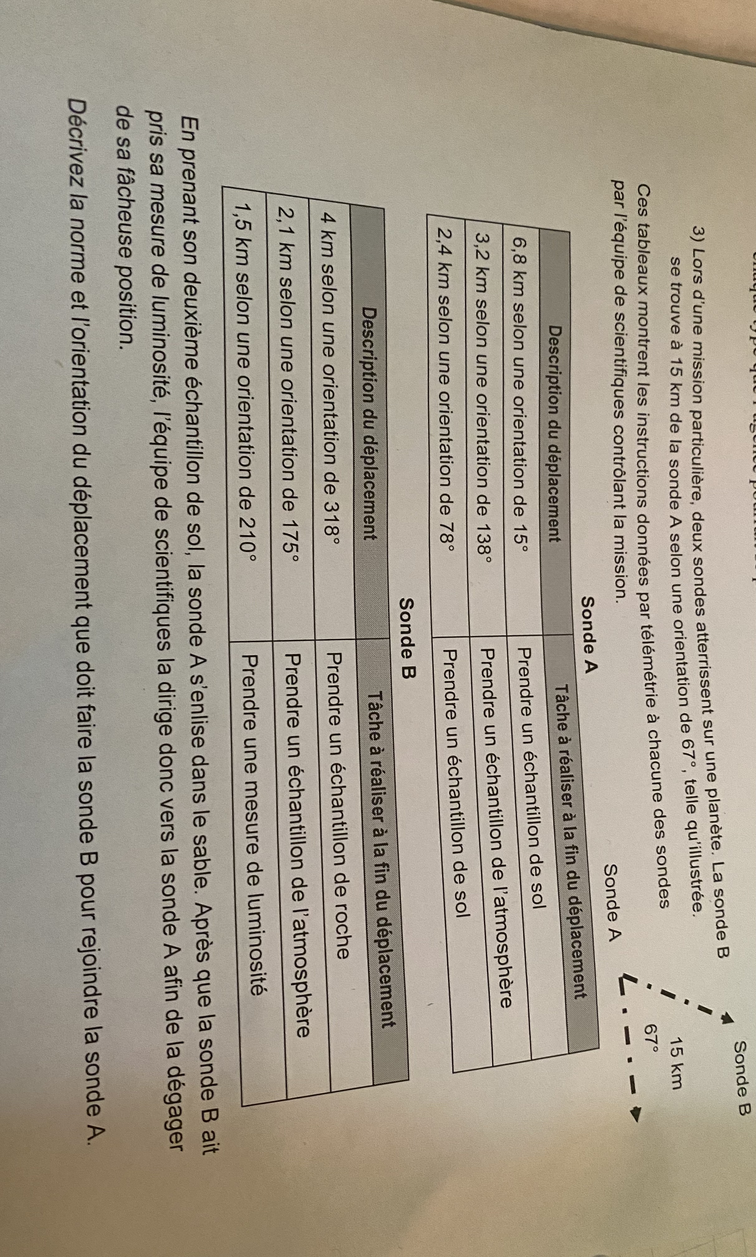 2) Grâce à l'échelle, à partir du point de départ de la sonde A sur le dessin, tu peux dessiner l'équivalent de 6,8 km orienté à 15 degrés (dans le sens antihoraire) par rapport à l'horizon.
