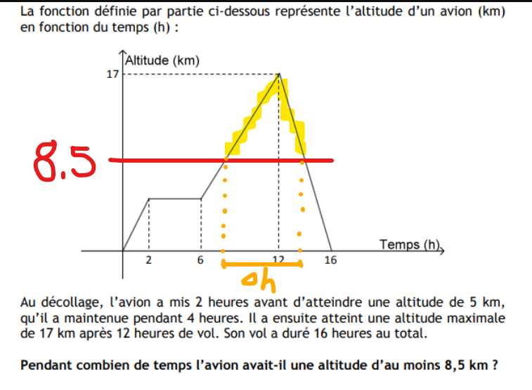 Cependant, n'oublie pas que la question est de déterminer le temps total passé au-delà de 8,5 km d'altitude. On cherche donc la variation de temps (Δh) entre le premier moment où l'avion est à 8,5 km d'altitude, lorsque l'avion monte, et le dernier moment, lorsqu'il redescend, comme illustré ci-dessous :