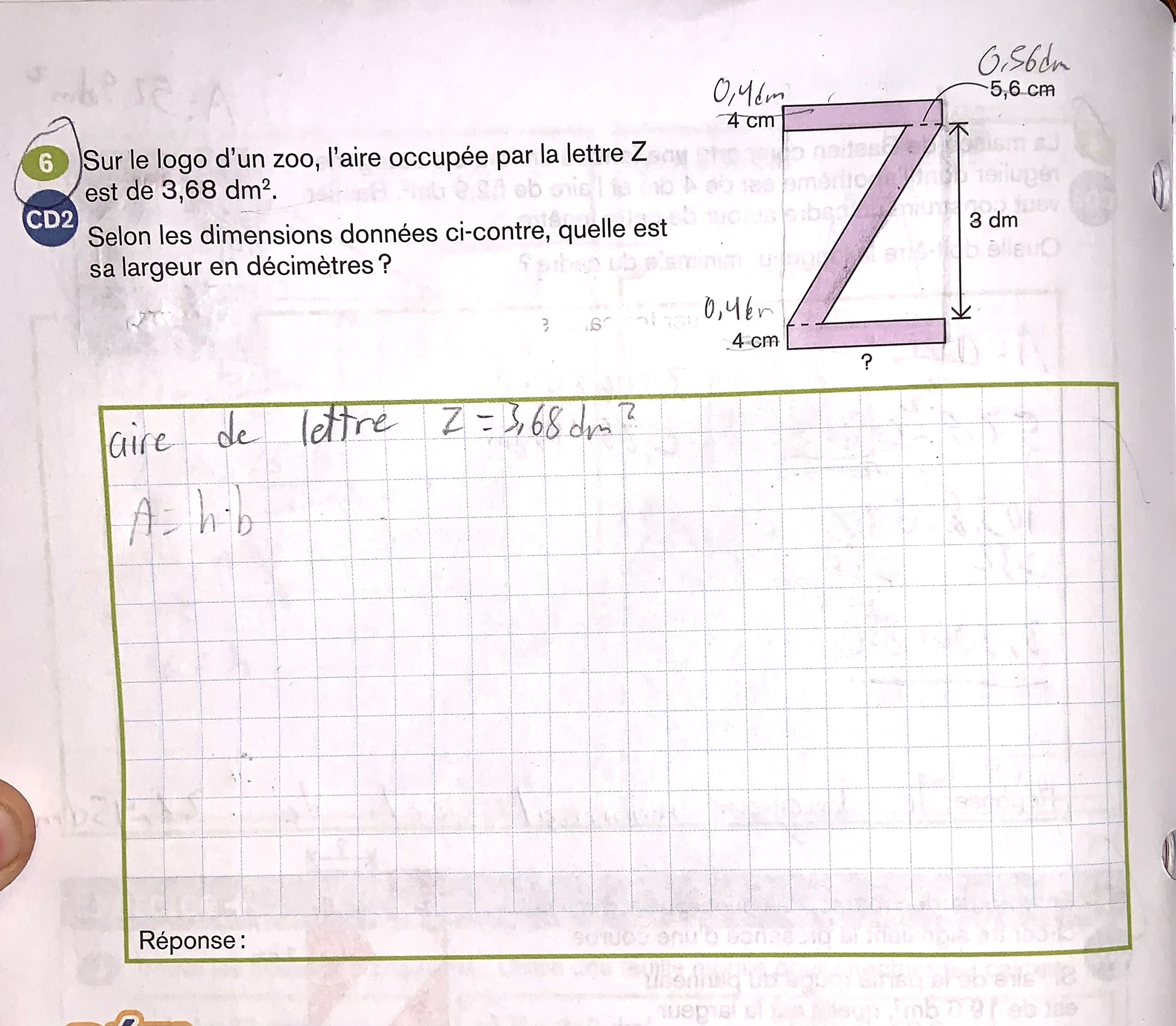 Comme ces derniers sont identiques, on peut alors diviser la valeur obtenue en deux pour connaître l'aire d'un seul rectangle. Avec la formule d'aire d'un rectangle et les données fournies, il sera ensuite possible de connaître la largeur du «Z».