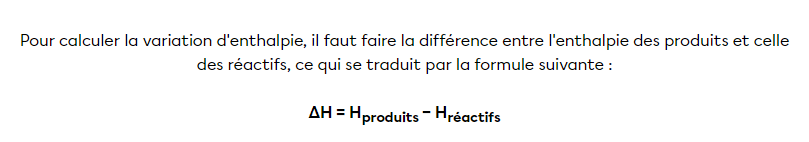 Pour trouver la variation d'enthalpie, tu dois trouver l'enthalpie des réactifs ainsi que celle des produits. Pour ce faire, tu dois soustraire la somme de l'énergie des liaisons chez les produits à celle des réactifs. Une fois que tu as l'enthalpie des réactifs et des produits, tu dois appliquer cette formule: