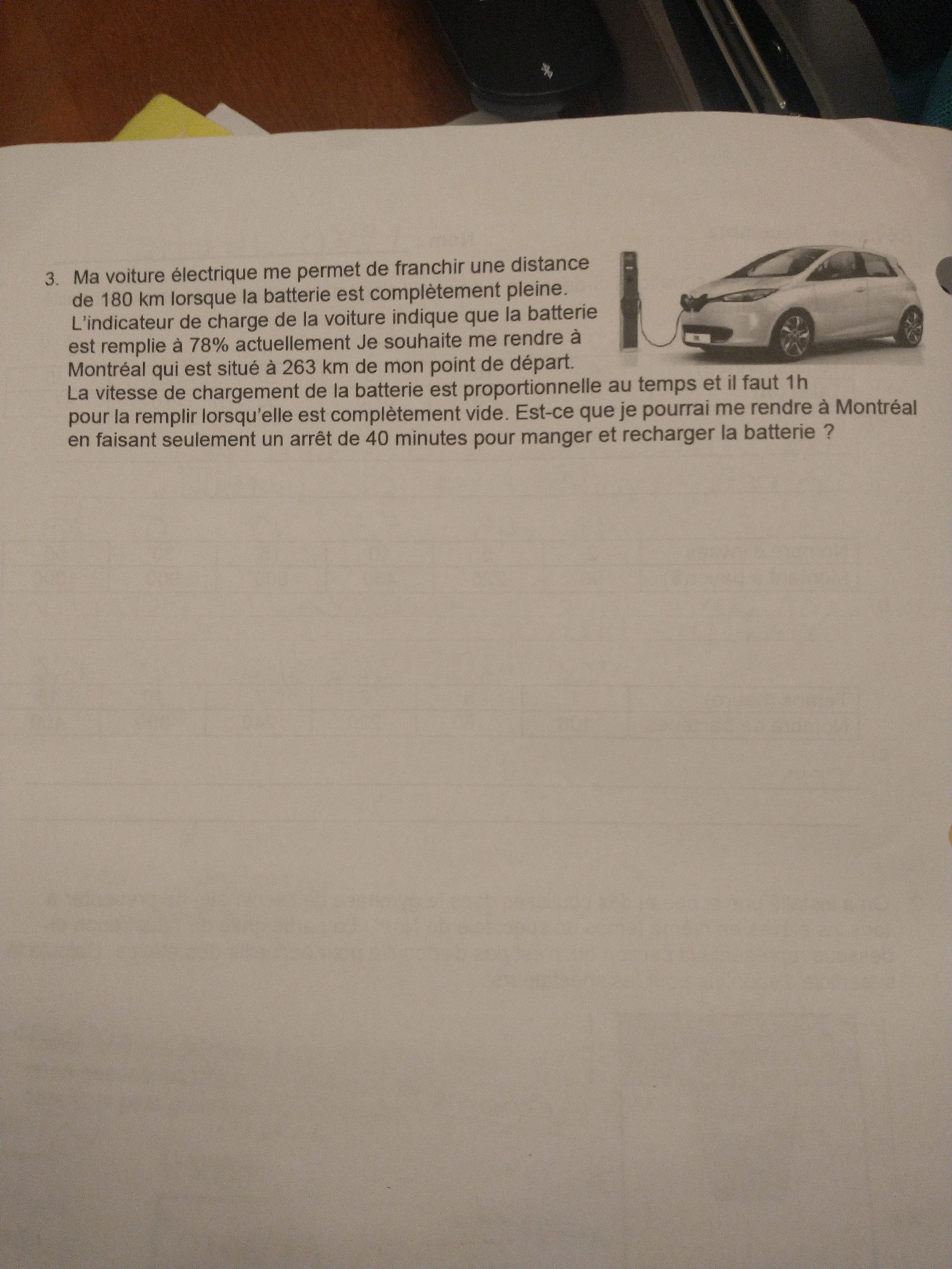 Présentement, la personne veut faire une distance de 263km et sa batterie est chargée à 78%. Déjà la , tu dois trouver combien de km il peut faire si sa voiture est chargé à 78%. Pour ce faire, tu dois effectuer un produit croisé. En gros, tu dois te demander, si je peux faire 180km quand c'est chargé à 100%, combien de km je peux faire quand c'est chargé à 78%.