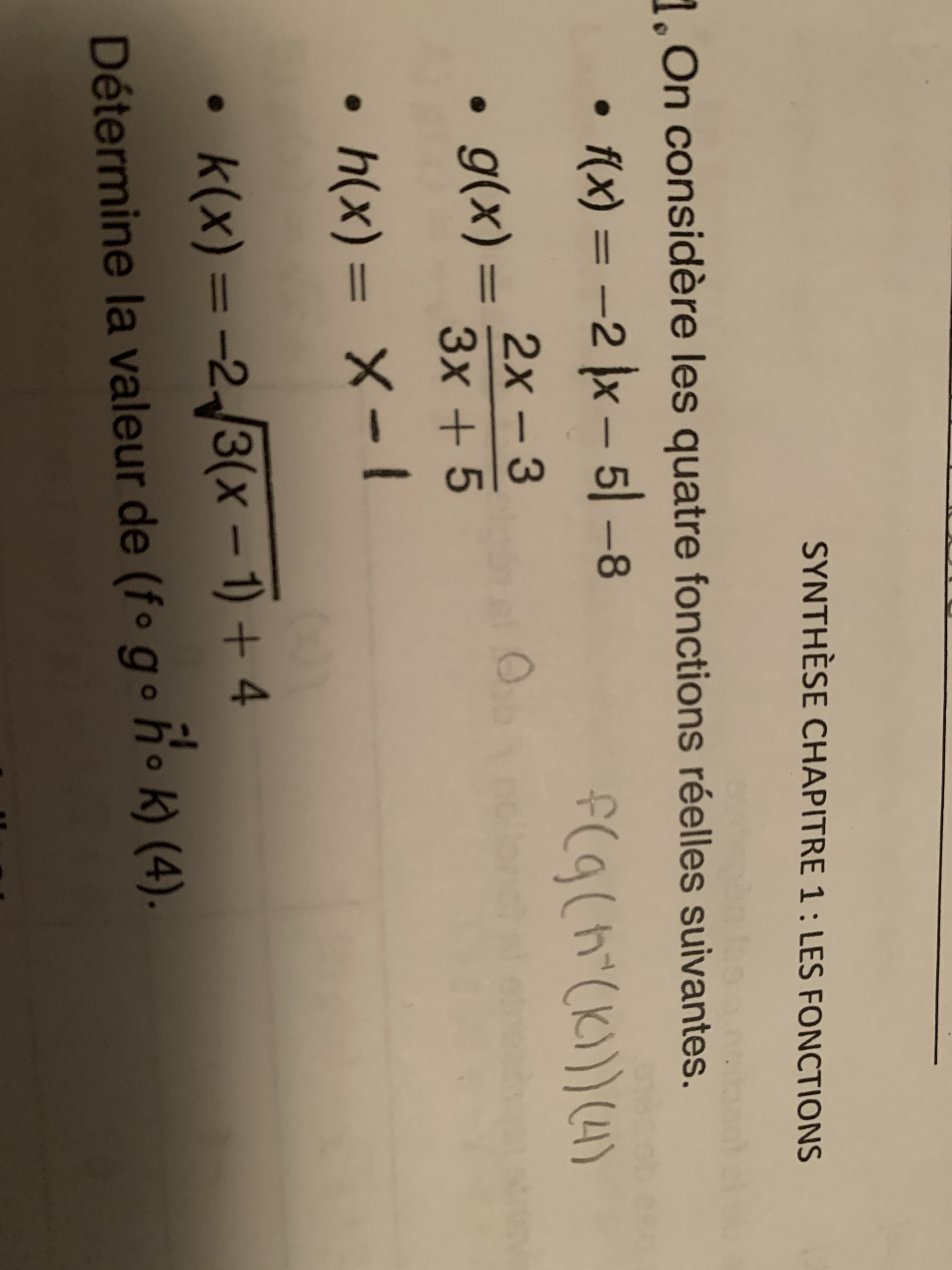 Bref, commence par trouver h^-1, pour pouvoir y insérer k. Insère ensuite cette fonction dans g et puis la nouvelle fonction dans f.