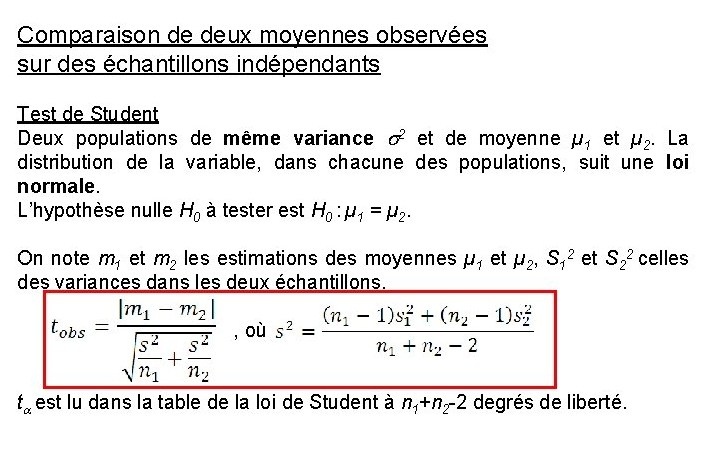 Si on suppose l'égalité des variances des populations alors on procède comme suit: