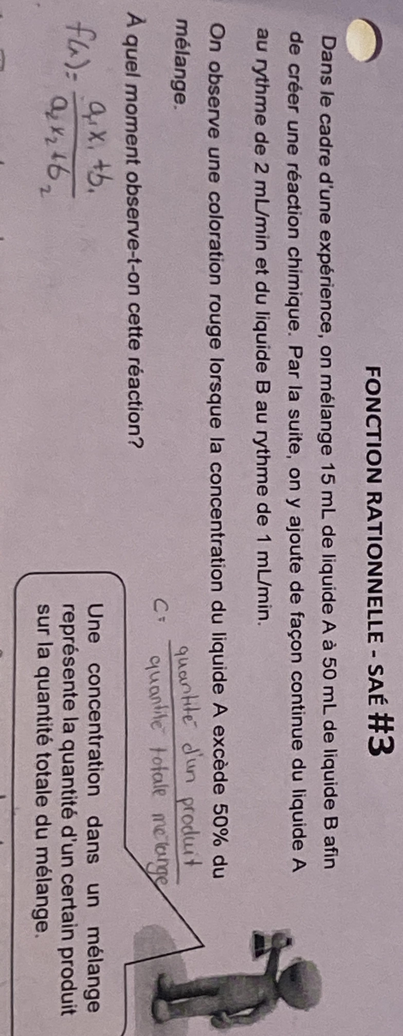 Tu as l'air d'avoir compris la base de l'exercice, à savoir la concentration est le fait de devoir trouver une fonction qui décrit la quantité totale et un qui décrit la quantité d'une espèce. Pour les bases, tu peux toujours visiter cette fiche alloprof :
