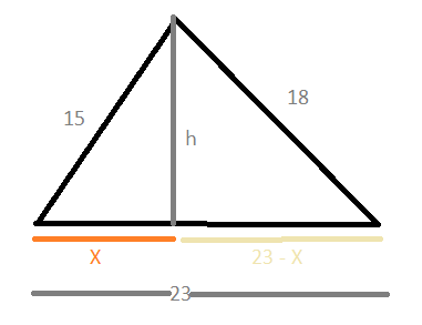 2ème équation : h^2 + (23-x)^2 = 18^2