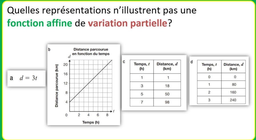 De plus, une fonction de variation partielle (polynomiale de degré 1) est une fonction où des variations constantes de la variable indépendante (x) entrainent des variations constantes et non nulles de la variable dépendante (y). Toutefois, contrairement à la fonction de variation directe, elle ne traduit pas une situation de proportionnalité puisqu’elle ne passe pas par (0,0).