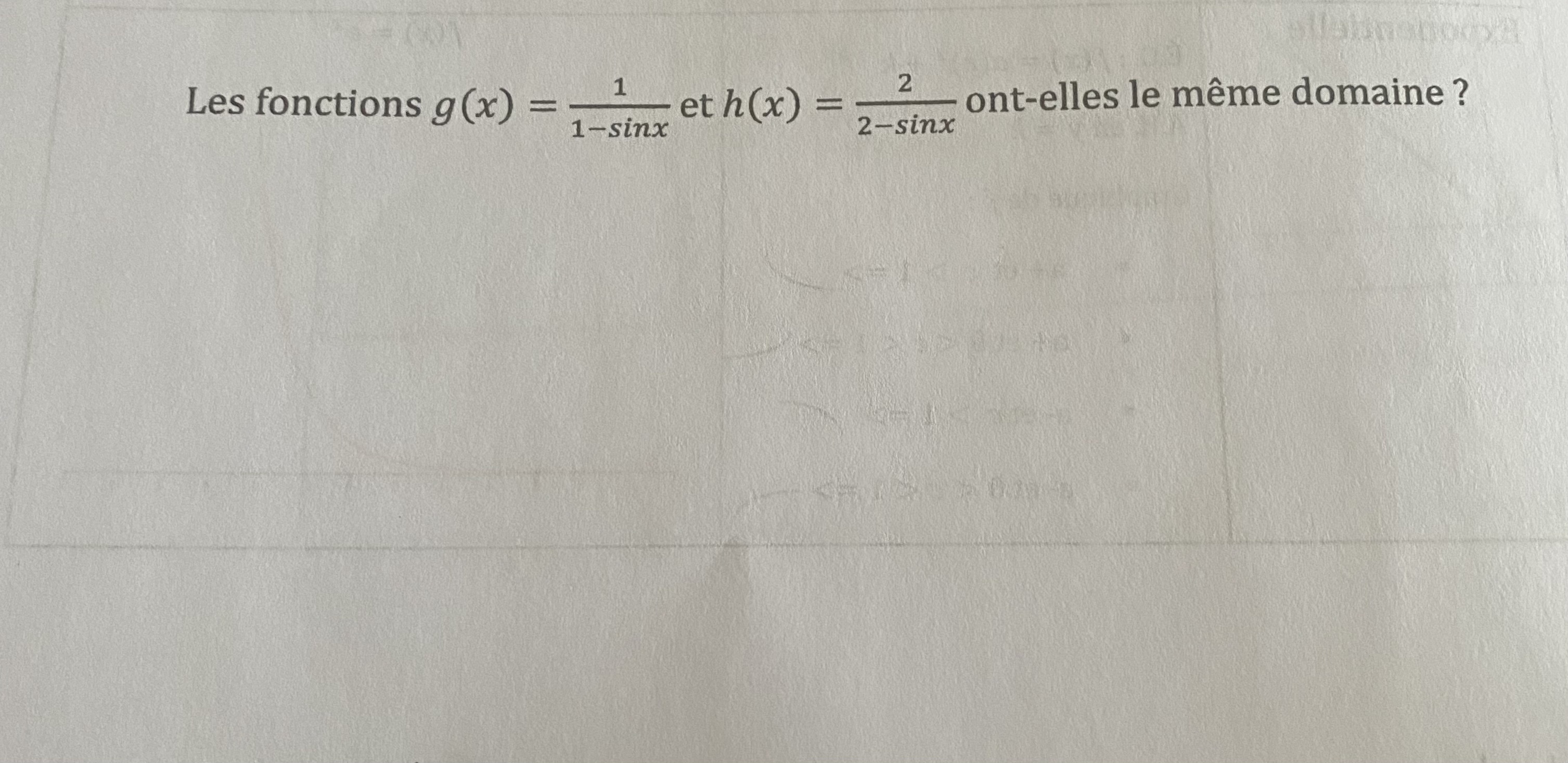 pour h(x) la condition est 2 - sinx différent de 0 donc sinx différent de 2 (ce qui est toujours vrai, car la valeur maximal de sin est 1) donc ici toute les valeurs de x sont corrects.