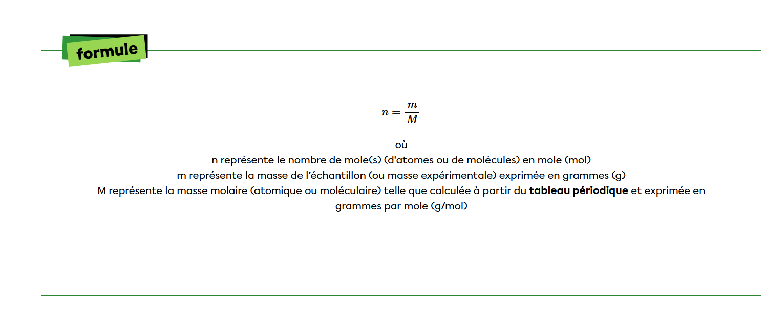 Méthode 2 : Tu utilises d'abord la formule pour calculer le nombre de moles total et tu emploies ensuite celle qui te permet de calculer le nombre de moles individuel.