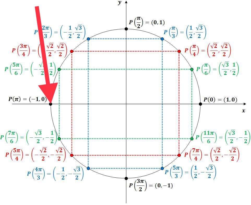 Si on souhaite aller plus vite et ne pas convertir l’angle en radian en degrés, on suit le même principe, mais au lieu de soustraire 360°, 180° ou 90°, on soustrait 2π, π ou π/2.
