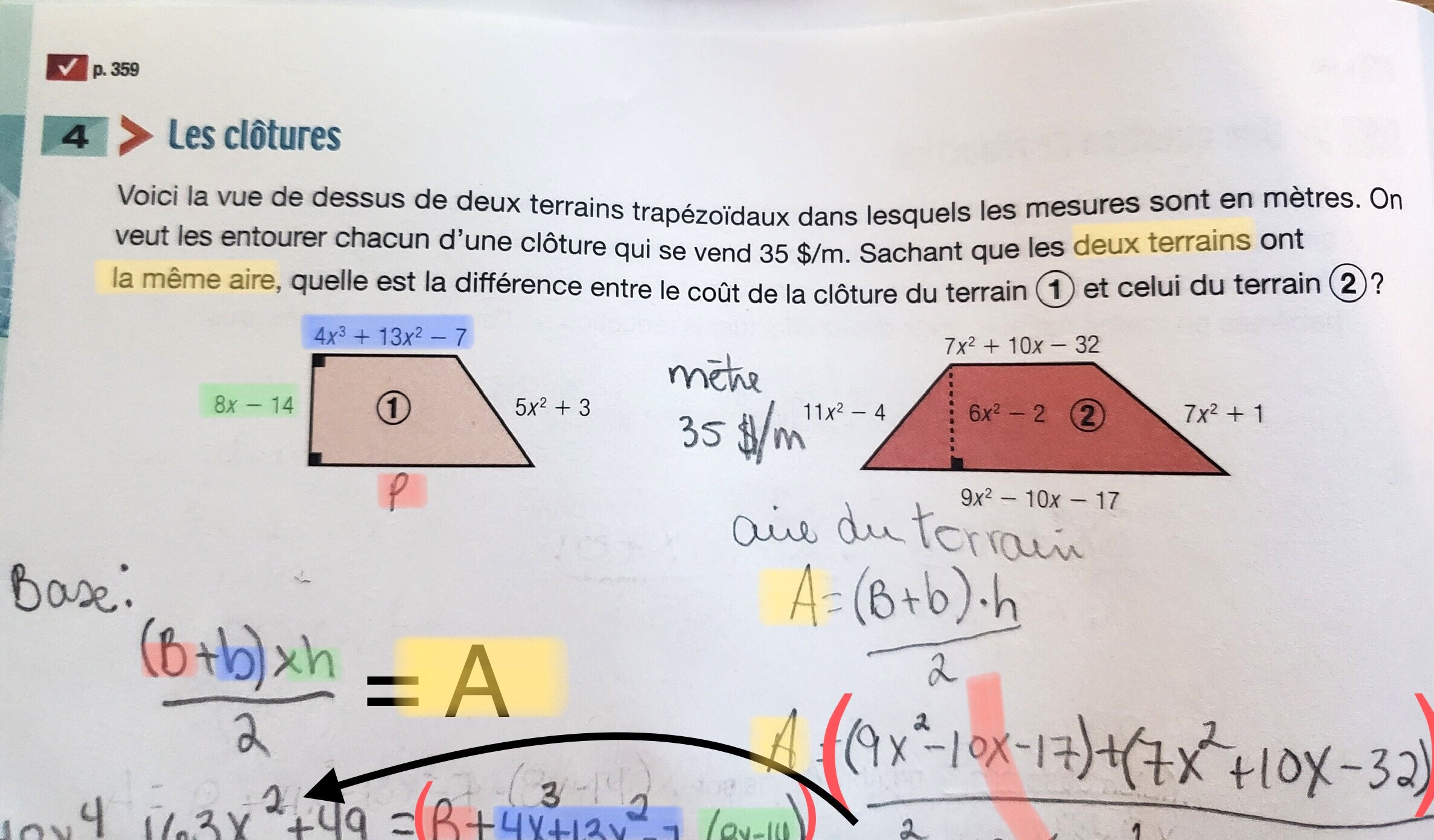 Tu as commencé par trouver l’aire du terrain numéro 2, soit de (48x^4 - 163x^2 + 49) mètres carrés. Puisque les deux terrains ont la même aire, on peut donc trouver la mesure de la grande base du terrain 1. Dans la formule d’aire d’un trapèze, soit A = h(B+b)/2, on insère les données connues et on isole la variable B pour trouver la mesure de la grande base. La division par 2 est simplement issue de la formule d’aire du trapèze.