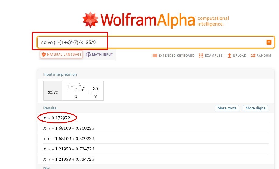 \[ \frac{1-(1+x)^{-7}}{x}=\frac{35}{9} \]