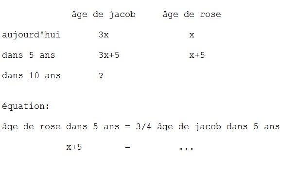 Aujourd'hui, Jacob a le triple de l'âge de sa soeur Rose. Quel âge aura Jacob dans dix ans si, dans cinq ans, sa soeur aura les trois quarts de son âge?