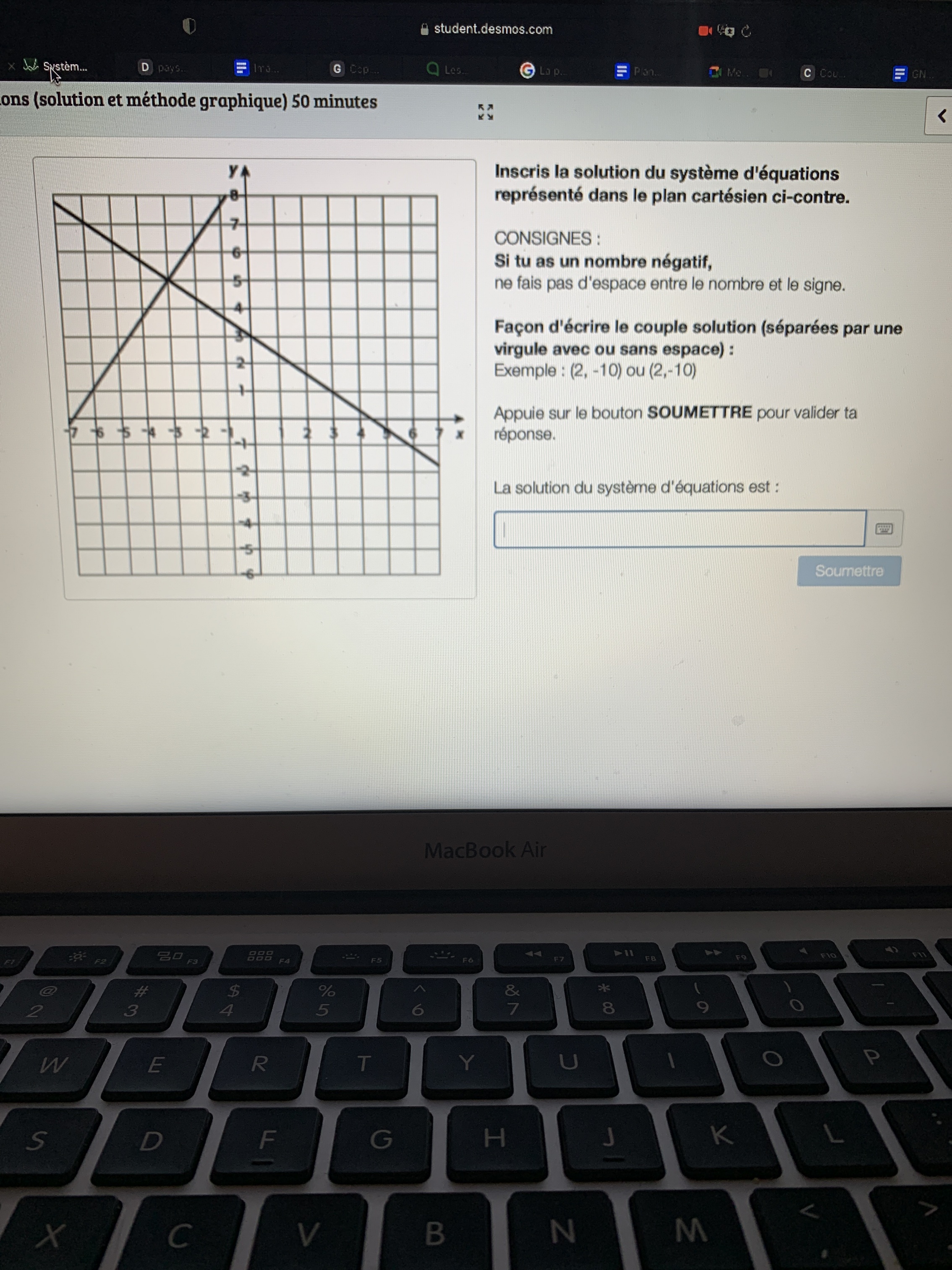 Il suffit d'entrer les coordonné où se croise les deux droite, dans ce cas, cela ressemble à (-3, 5), le logiciel semble être stricte sur la façon dont il faut entrer les coordonnés.