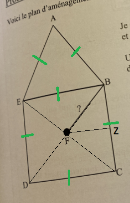 Alors, comme tu peux le voir, toutes les lignes avec un trait vert possèdent la même longueur. De plus, car BCDE est un carré, la mesure de ZC et ZF est égale à la moitié de la mesure BC.