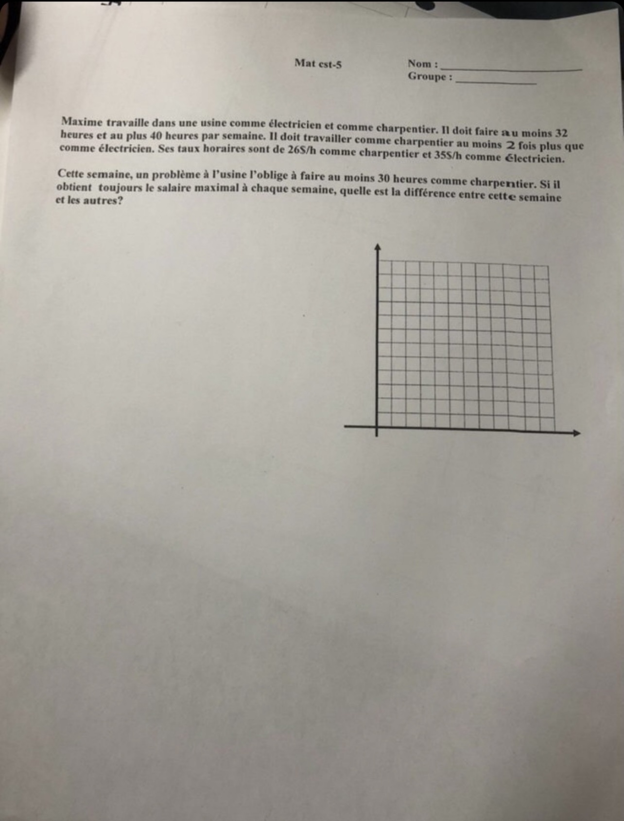 Je te laisse traduire le reste de l'énoncé en inéquation et en équation. Tu peux poser S comme étant son salaire cumulé des 2 métiers, ce sera la fonction à optimiser (étape 3).